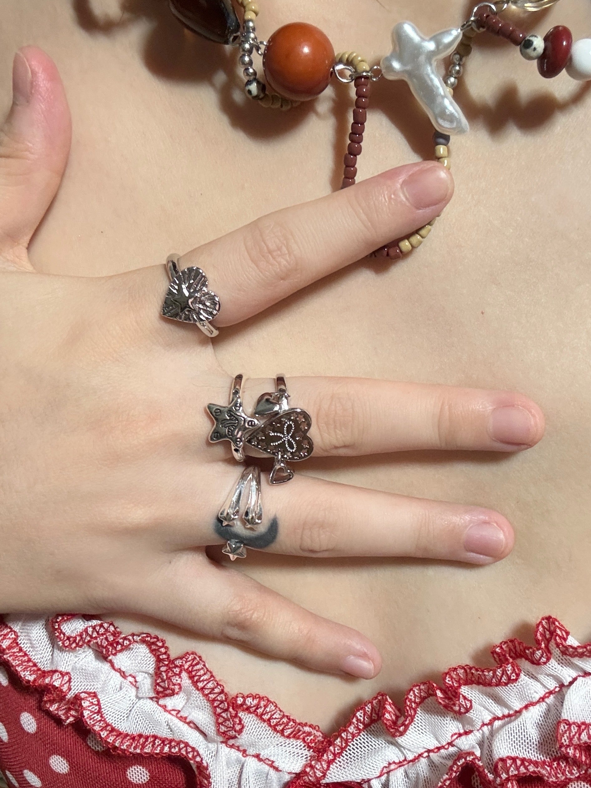 This four-piece silver ring set blends playful celestial energy with a touch of vintage coquette elegance. Each ring has its own personality, from engraved stars to whimsical hearts and mushrooms. Wear them stacked or separately to add a dreamy, perfect look to your everyday look.