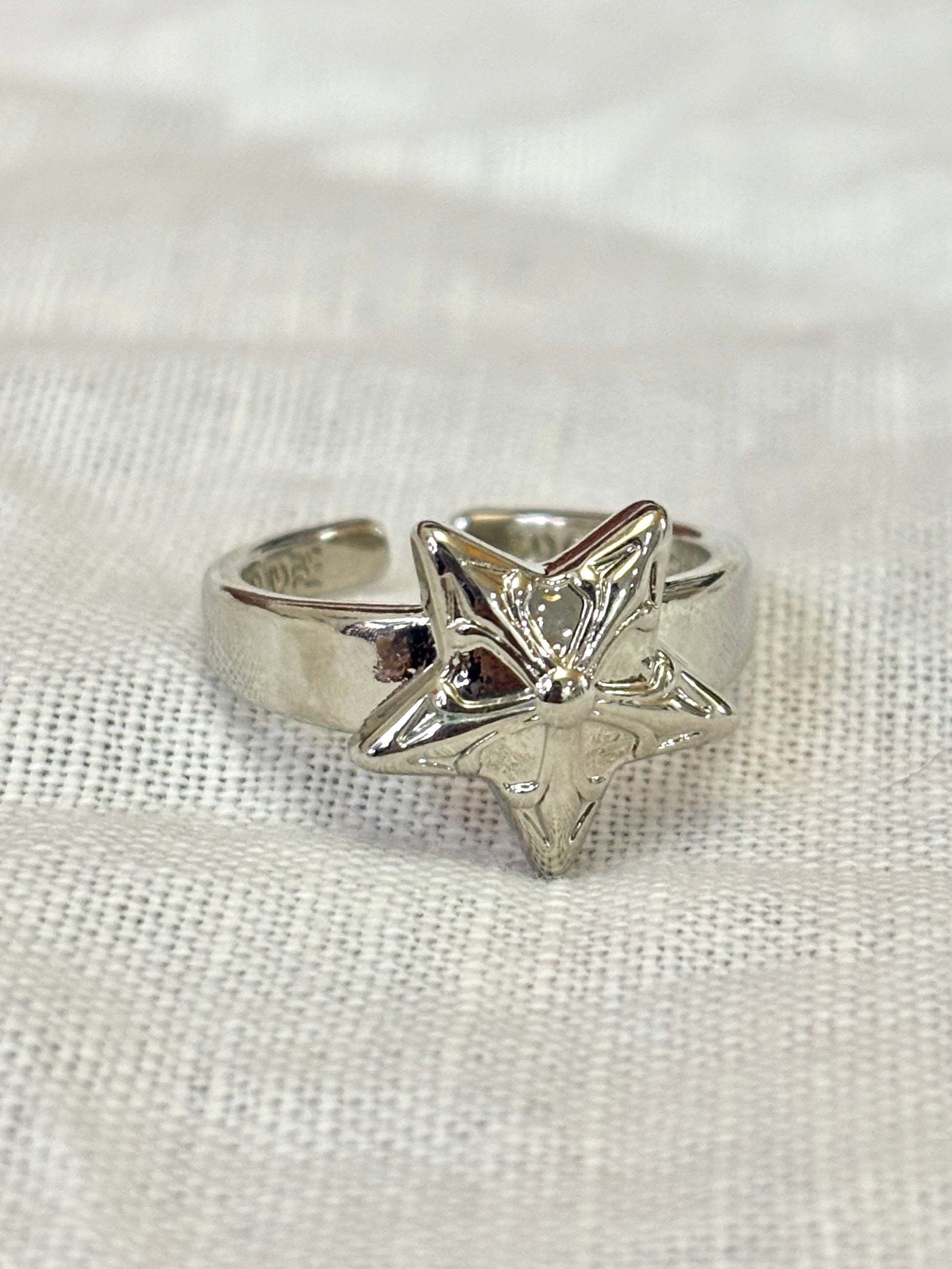 A chunky silver-toned ring featuring a large, raised star with etched details. Its wide, adjustable band makes it a perfect standout piece for a cool, edgy look.