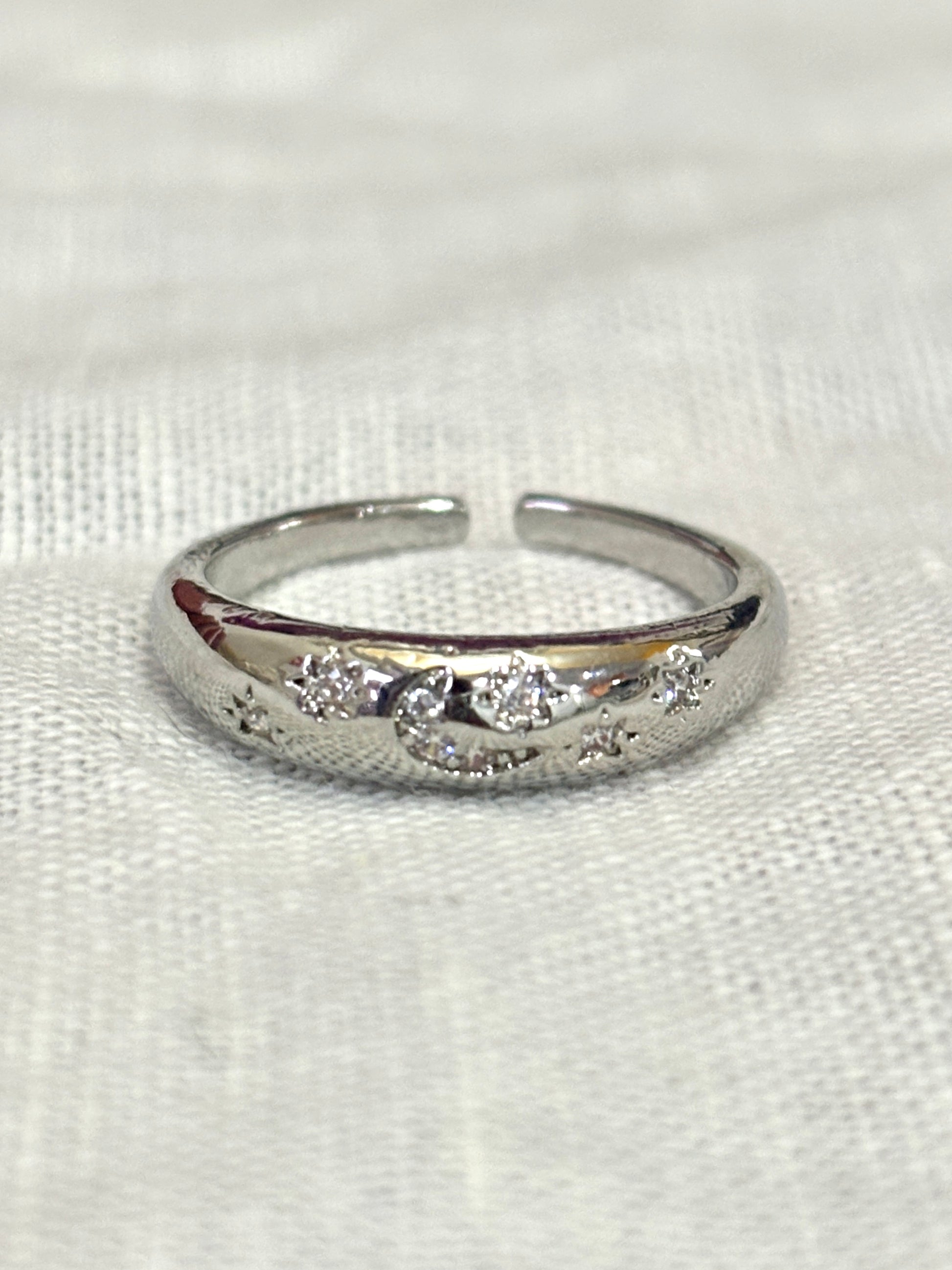 A dainty silver band engraved with a crescent moon and tiny twinkling stars. The open-back design allows for a custom fit, making it an easy piece to stack with other rings.