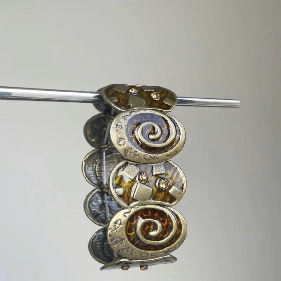 Featuring bold button-like medallions engraved with swirling spirals and ancient-style symbols, this bracelet brings together vintage artistry and a touch of mystery.
